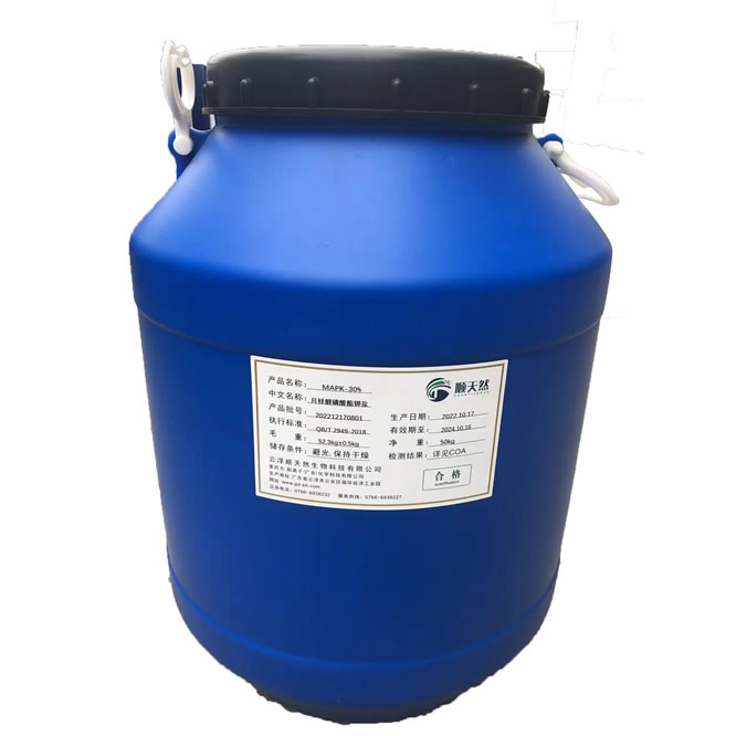 MAPK 30 單烷基磷酸酯鉀鹽是溫和型陰離子表面活性劑,其化學結構與人體生物膜類似,所以與皮膚的親和性優異。具有親水性強,泡沫好的特點,單酯含量控制在90%以上。產品溫和性、乳化性、起泡性、穩定性特別優異,可用于許多低活性物含量的體系中,起增泡、穩泡、乳化、清潔的作用。廣泛用于潔面劑、沐浴露、洗發水、兒童洗浴等洗滌品和個人護理用品中,可作為主、輔表面活性劑使用。